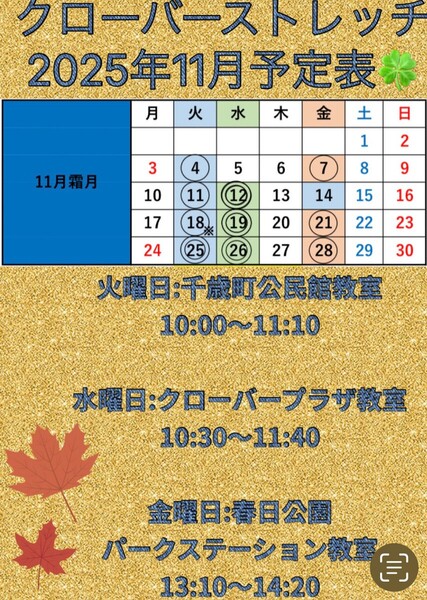 🍀教室・スケジュール表について🍀 福岡県春日市の公共施設で「定期ストレッチ教室」を開催中! ※詳細は下線部をクリック、タップしてご覧ください。 ※その他、オプション教室も単発でご参加いただけます。
