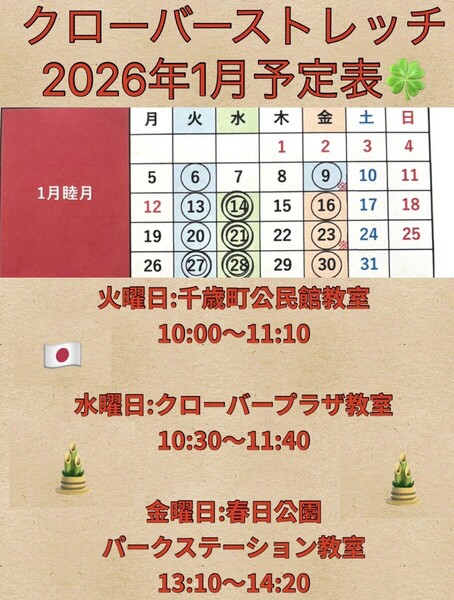 🍀教室・スケジュール表について🍀 福岡県春日市の公共施設で「定期ストレッチ教室」を開催中! ※詳細は下線部をクリック、タップしてご覧ください。 ※その他、オプション教室も単発でご参加いただけます。